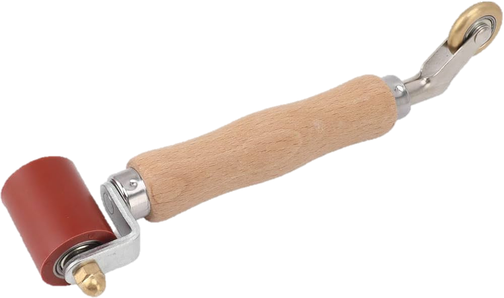 La roulette à maroufler est dotée, d’un côté d’une partie en silicone qui permet de favoriser l’adhérence de la membrane sur son support et de l’autre d’une roulette en laiton de 5 mm de large qui est utilisé pour les détails et un bon marouflage des angles.